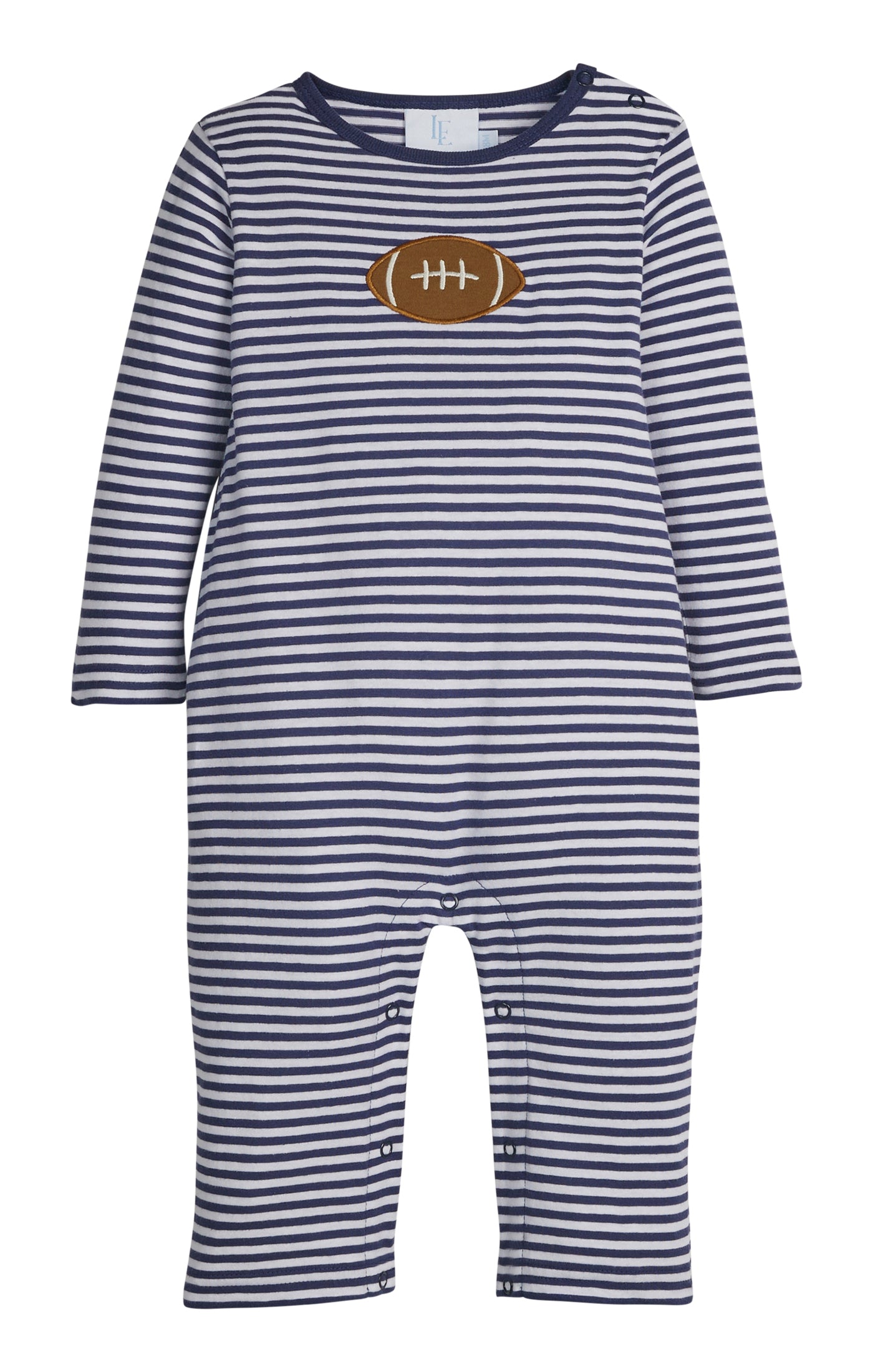 Down, Set, Hut, Hike! Dress your little boy in our navy and white stripe Applique Romper - Football. It is 100% cotton and perfect for watching games at home or in person. Big Brother can match in our Applique T-Shirt - Football.