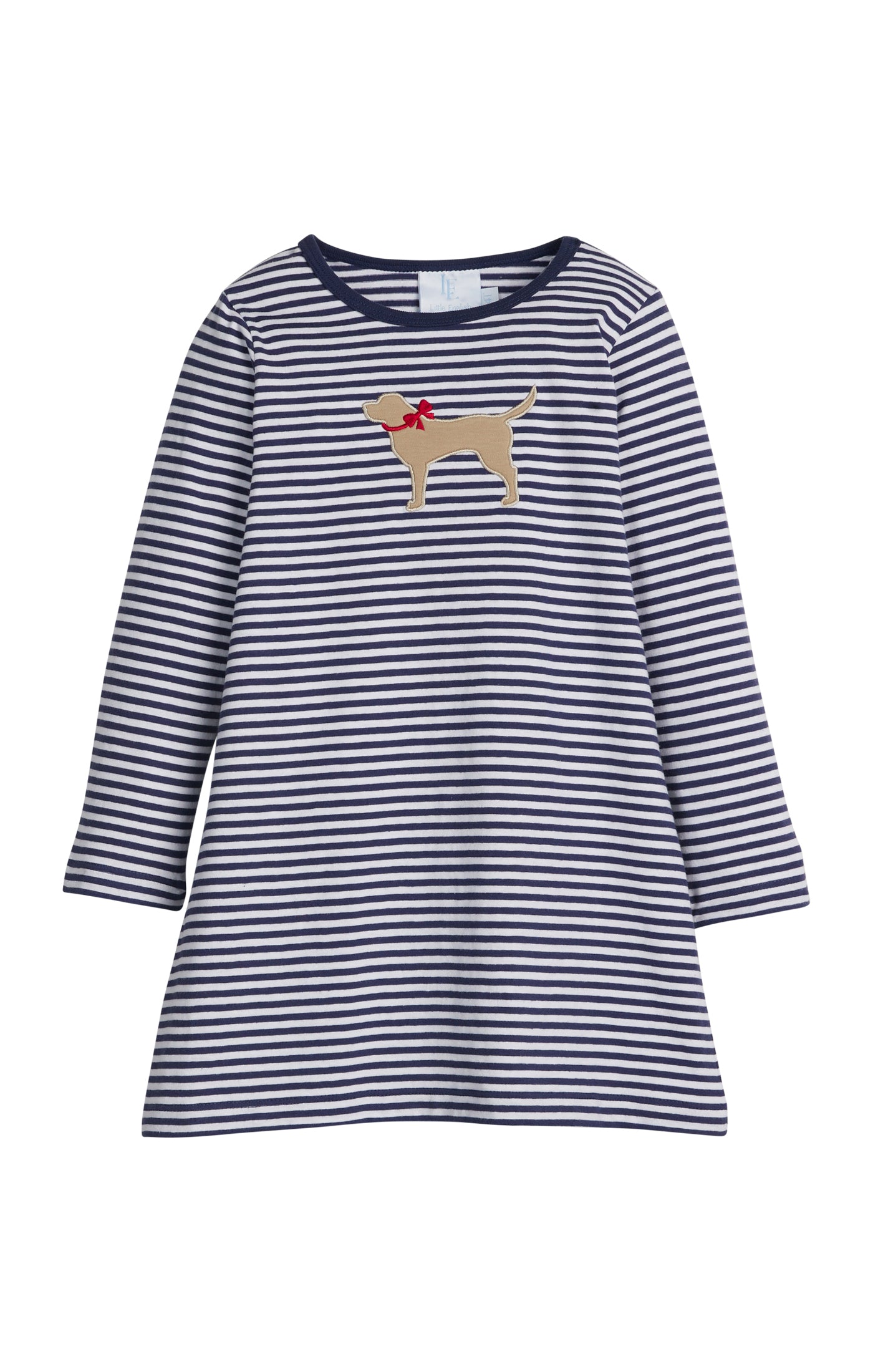 Little English labs are favorites year after year, and our FaLaLa Labradors are no different with this traditional combination of navy & red. Our Applique T-Shirt Dress is a classic, long sleeve knit style on a navy and white stripes. The center chest features an adorable applique lab with a sweet red bow collar. Fun, festive, and comfortable, your little lab lover can play all day, and siblings can coordinate in these fun styles.