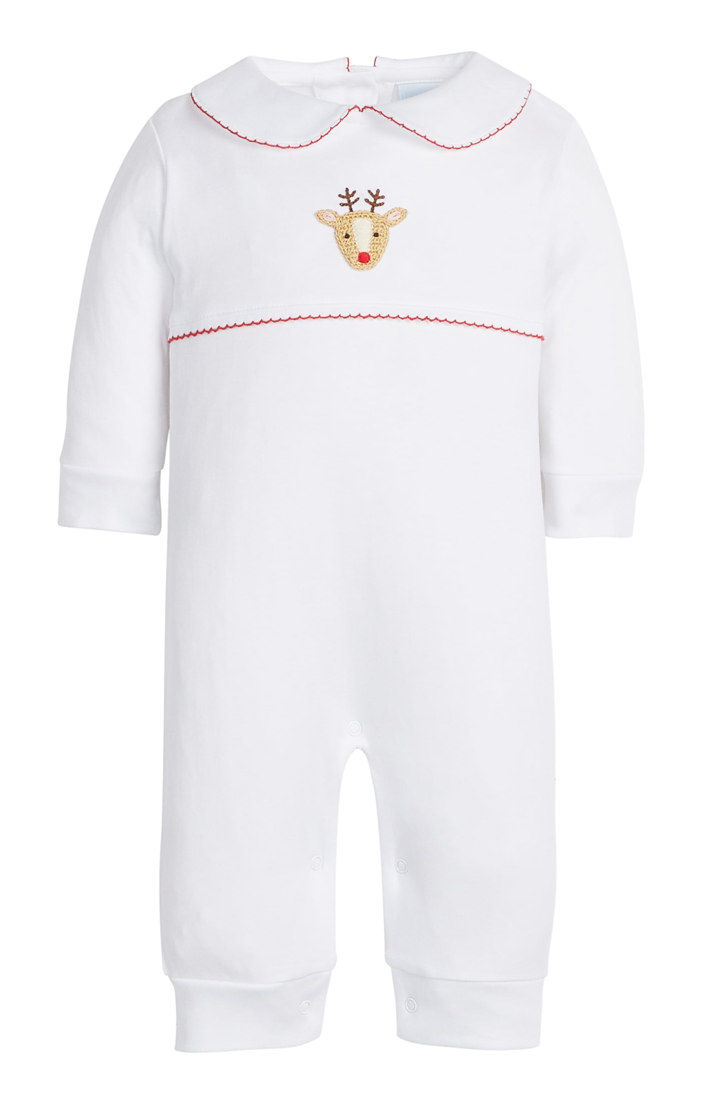 Get ready for those reindeer games in our cutest holiday crochet yet! Made from the softest white pima cotton and trimmed in red picot, our Reindeer Crochet Playsuit will be your favorite holiday heirloom piece. The red-nosed reindeer crochet detail is hand-stitched by expert hands so your garment will last through lay and play!