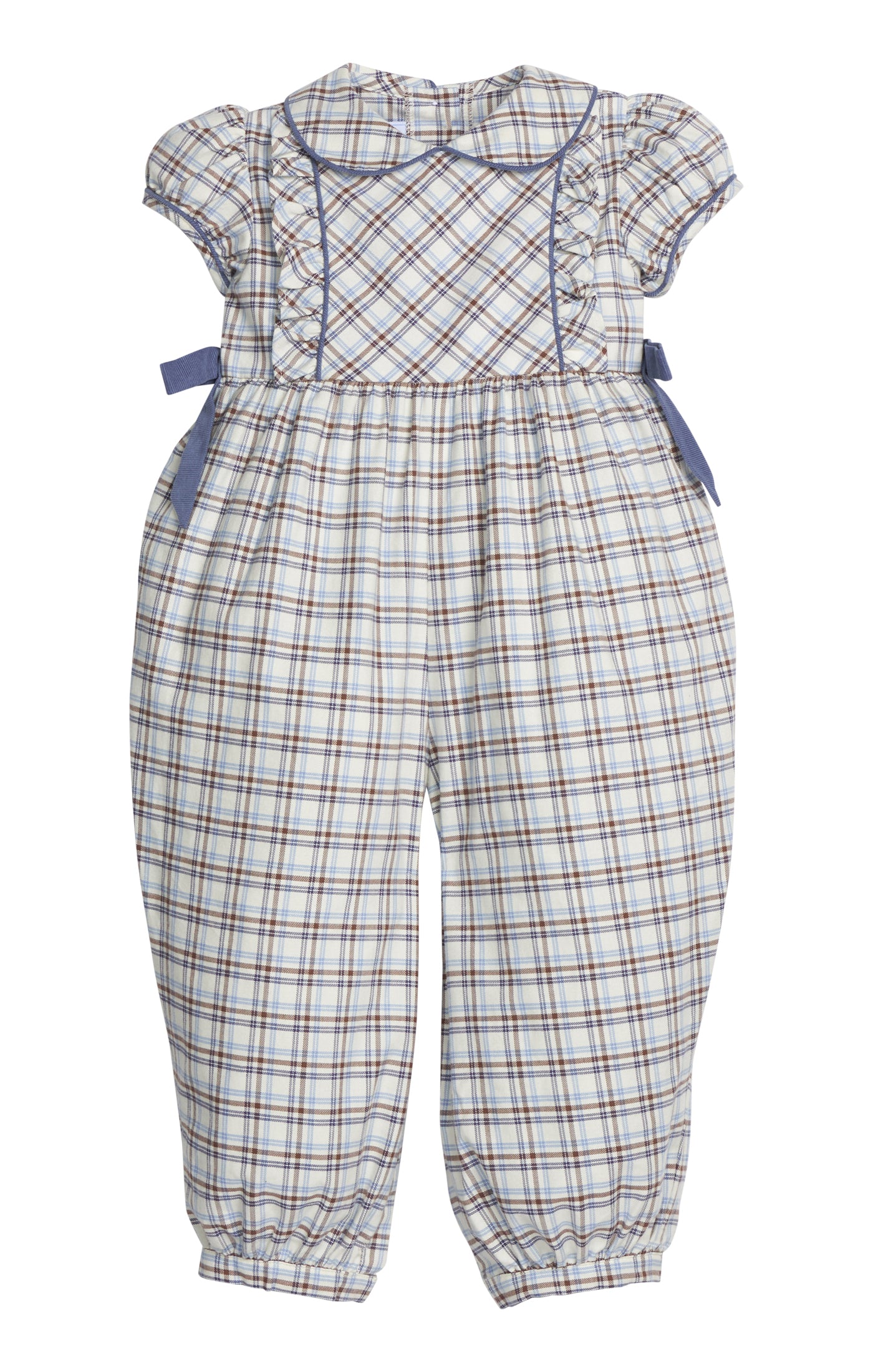 Clarkson is a classic autumnal collection that features a beautiful cream-based plaid with shades of blues and browns. Our new Hazel Romper is a darling option for baby girls with our signature peter pan collar, capped sleeves, and gathers at the waist. A ruffled placket at the chest and Stormy Blue Corduroy piping and fixed bows on either side give this one-piece an extra special touch. Versatile and timeless, it's the perfect option for Thanksgiving celebrations or fall family photos, and siblings can easily coordinate in other pieces from our Clarkson Collection.