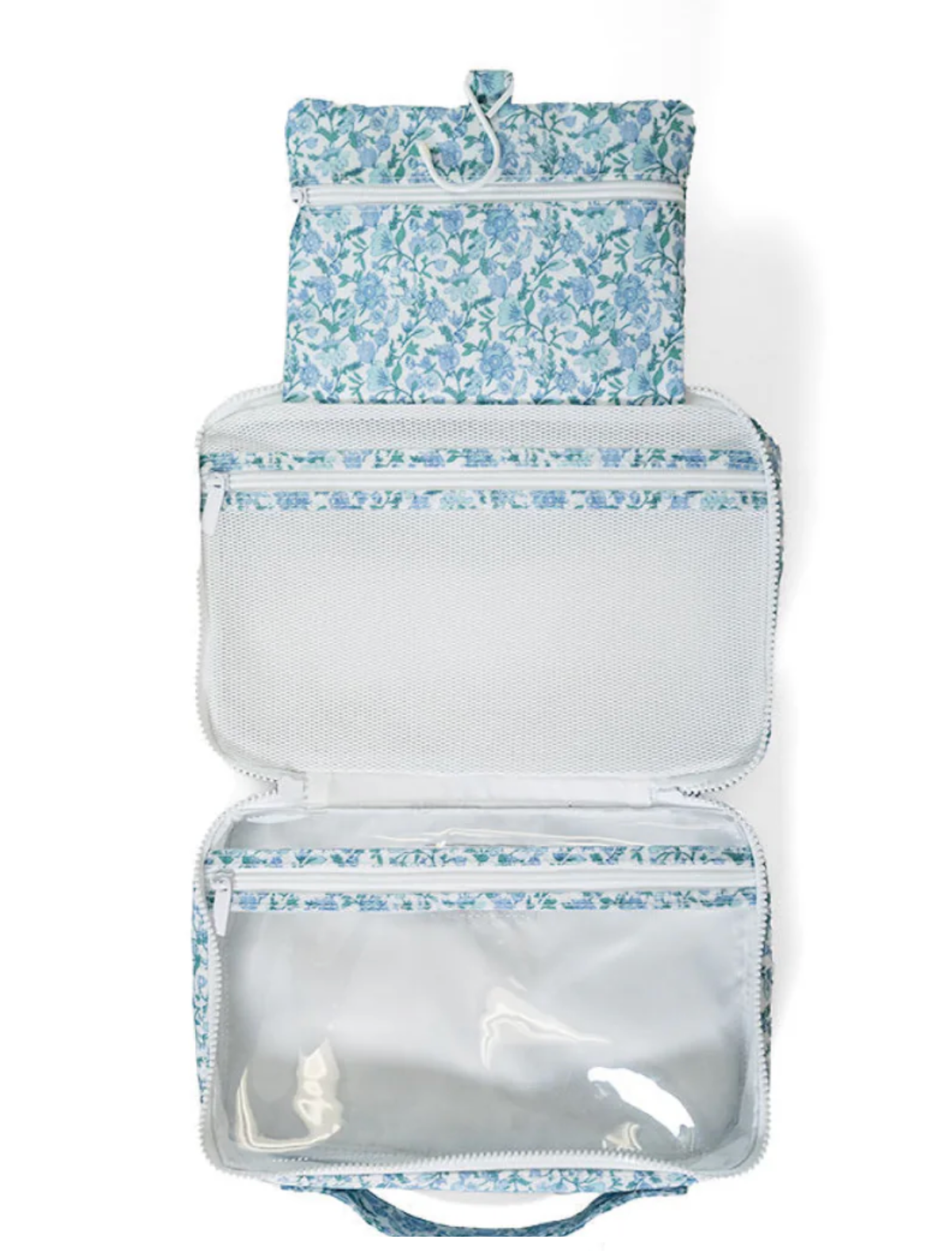 Bundle Up2! Our hanging toiletry bag keeps you organized with ease! Use this fold up for makeup or toiletries, even baby and family TRVL! There are 3 inside roomy pockets - one in clear, one in mesh and an extra pouch for all the tiny items to hang with a hook. And a full exterior pocket for additional items and made in our Signature custom print and eco-friendly coated fabric!