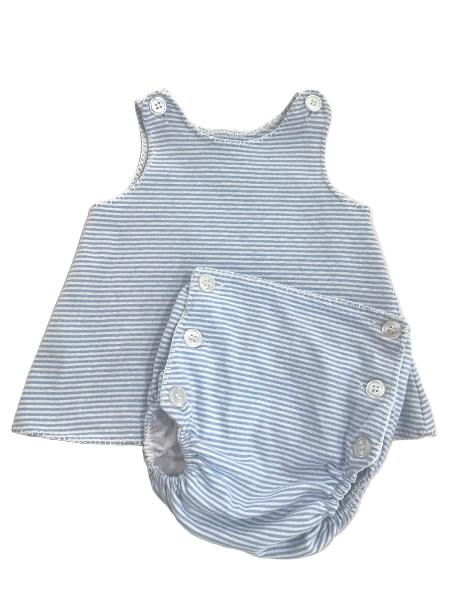 Meet the Blue Stripe Heirloom Sun Set baby bloomer set! A gentle nod to timeless style. Delicate blue stripes on soft, breathable fabric keep little ones comfortable through warm days and playtime. Designed to last through seasons and siblings, this sweet essential pairs beautifully with any wardrobe!