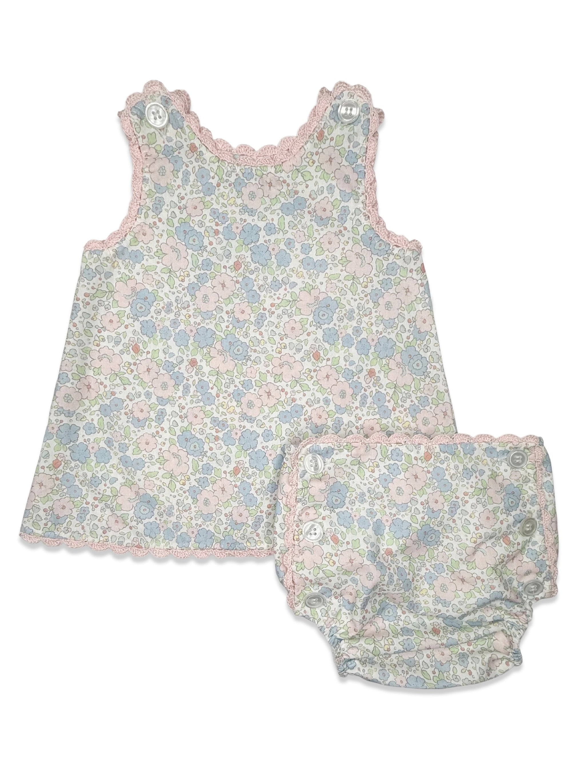 Meet the Lynwood Floral Heirloom Sun Set baby bloomer set! A gentle nod to timeless style. Delicate florals on soft, breathable fabric keep little ones comfortable through warm days and playtime. Designed to last through seasons and siblings, this sweet essential pairs beautifully with any wardrobe!