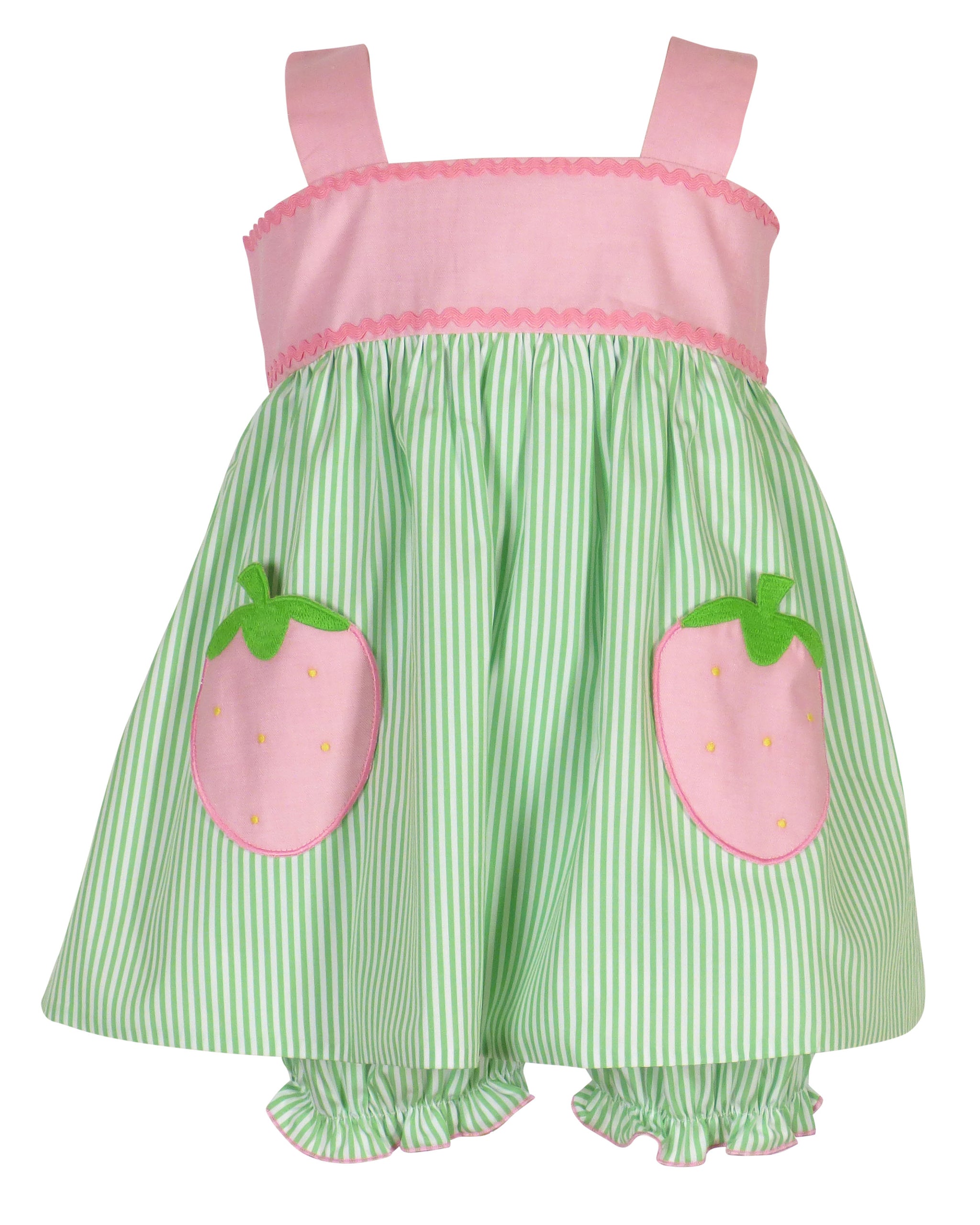 Adorable bloomer set featuring a charming green stripe design with a delightful strawberry pocket detail. Perfect for little ones who love playful, whimsical style. Soft, comfortable fit ideal for everyday wear or special occasions. A sweet addition to any child's wardrobe that combines fun prints with practical comfort.
